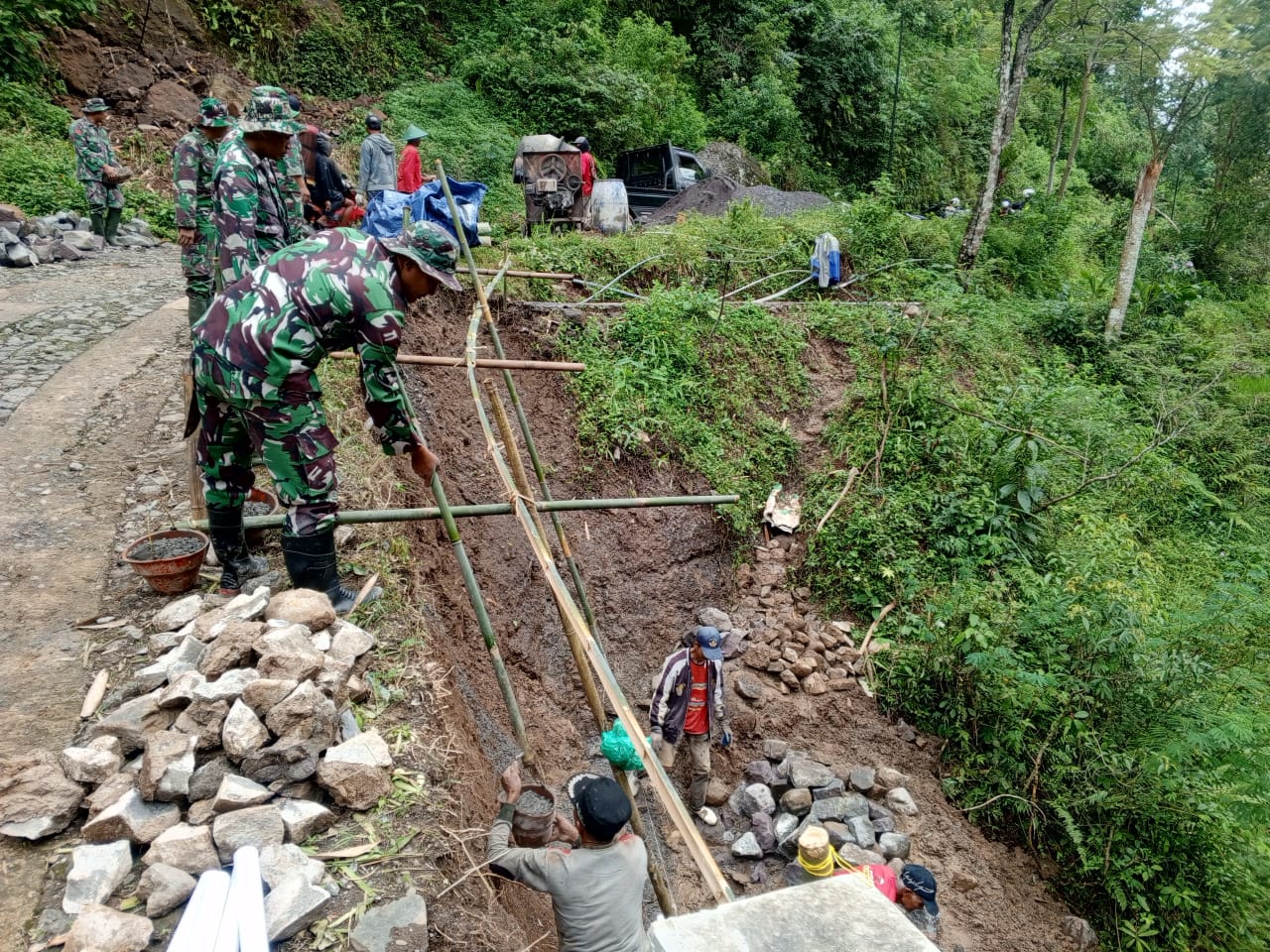 Matalensa || Wonogiri – Di tengah sunyi wilayah terpencil yang selama ini luput dari sorotan, derap langkah prajurit TNI berpadu dengan keringat warga memecah keheningan. Melalui program TMMD, pembangunan talud dikebut tanpa mengenal lelah. Batu demi batu disusun, tanah digali, dan semen diaduk, Anggota Satgas TMMD Reguler ke-127 menunjukkan semangat juang yang tinggi dalam melaksanakan pembangunan talud untuk penahan jalan. Di Desa Kembang Kec. Jatipurno Kab. Wonogiri, Kamis (12/2/2026).