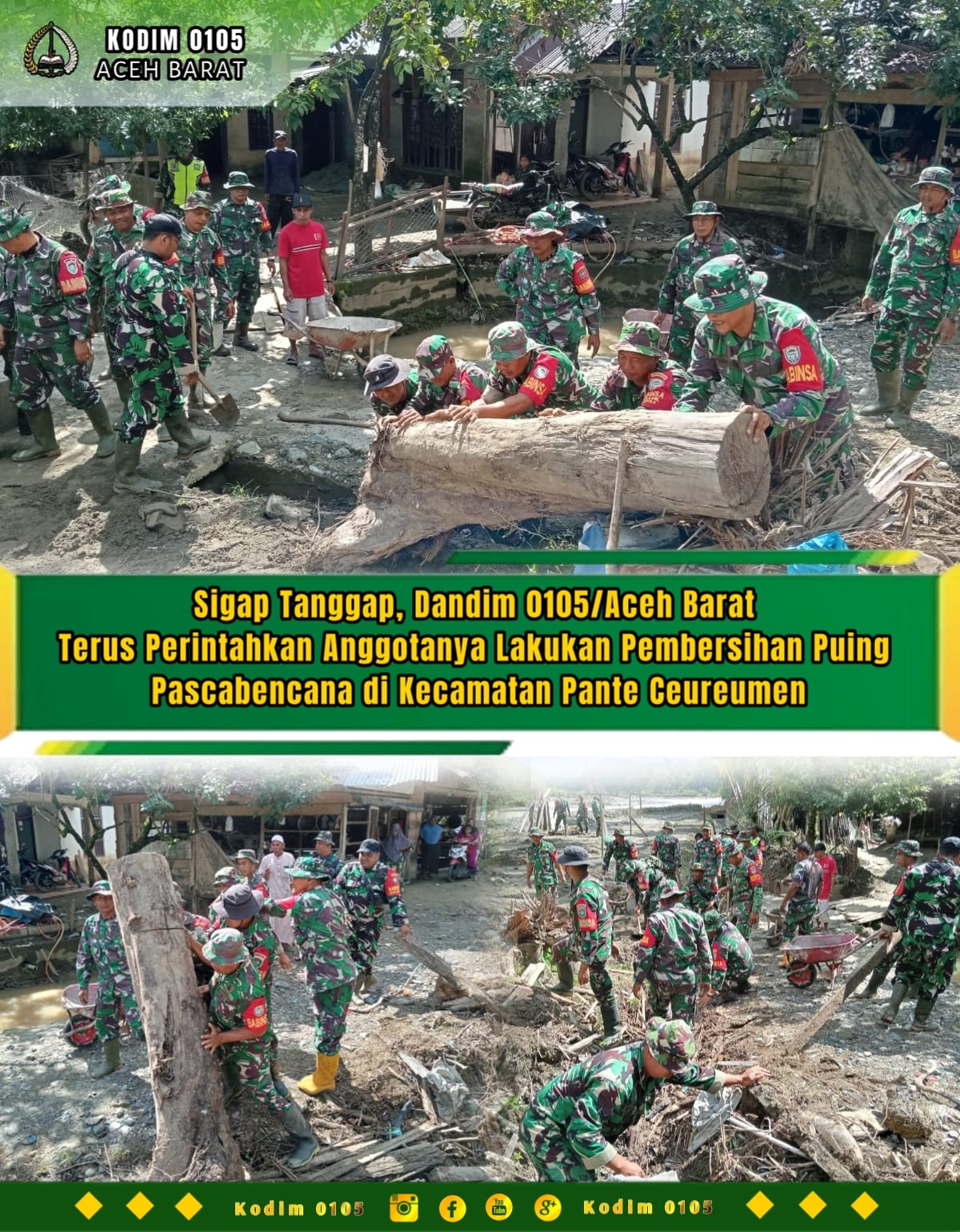 Matalensa || Aceh Barat – Wujud kepedulian dan respons cepat terhadap masyarakat terdampak bencana kembali ditunjukkan oleh Komando Distrik Militer (Kodim) 0105/Aceh Barat. Pasca terjadinya bencana alam, Dandim 0105/Abar Letkol Inf S Kembaren.S.E.,M.I.P.,CFrA., langsung memerintahkan jajarannya untuk terus ke lapangan membantu proses pembersihan puing-puing dan material sisa bencana. Layaknya hari ini puluhan Prajurit membersihkan bersama masyarakat melakukan pembersihan di Desa Ketambang Kecamatan Pante Ceureumen, Rabu (14/1/2026).