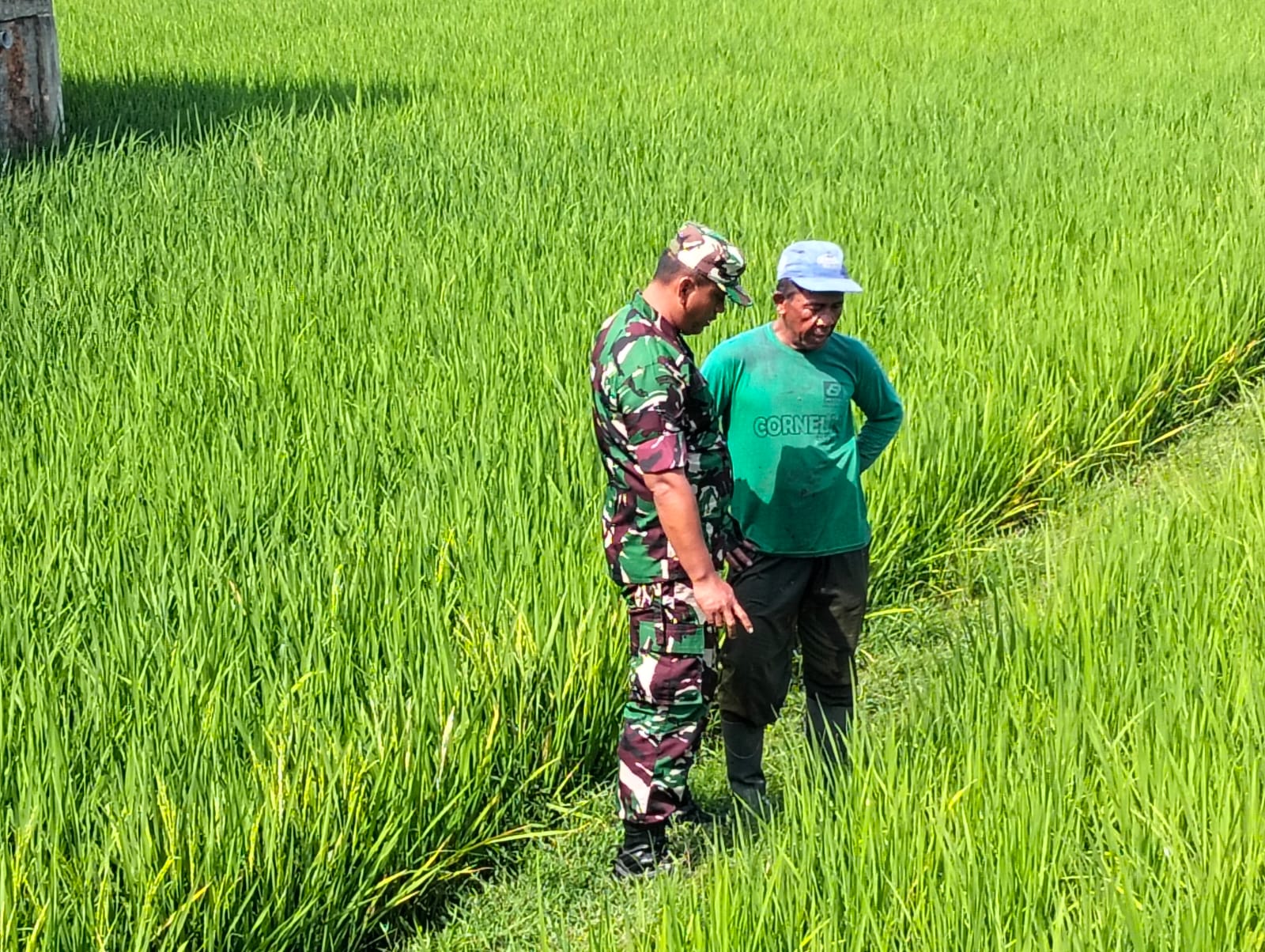 Dalam kegiatan tersebut, Babinsa bersama petani turun langsung ke sawah untuk melihat kondisi tanaman padi yang saat ini masih dalam fase pertumbuhan hijau. Serda Rahmat turut mengingatkan petani agar lebih waspada terhadap serangan hama yang dapat mengganggu hasil panen, terutama pada masa pertumbuhan seperti sekarang ini.
