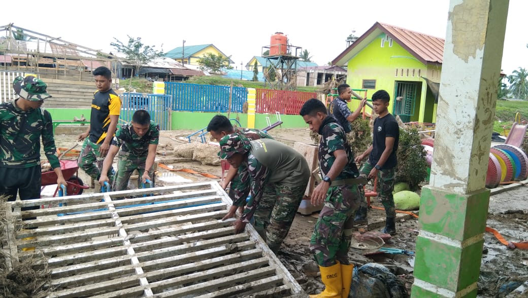 Sinergi Tanpa Batas, Prajurit Yon Kav 11/MSC dan Koramil 29/LKH Berjibaku dengan Lumpur Bersihkan TK Simpang Tiga