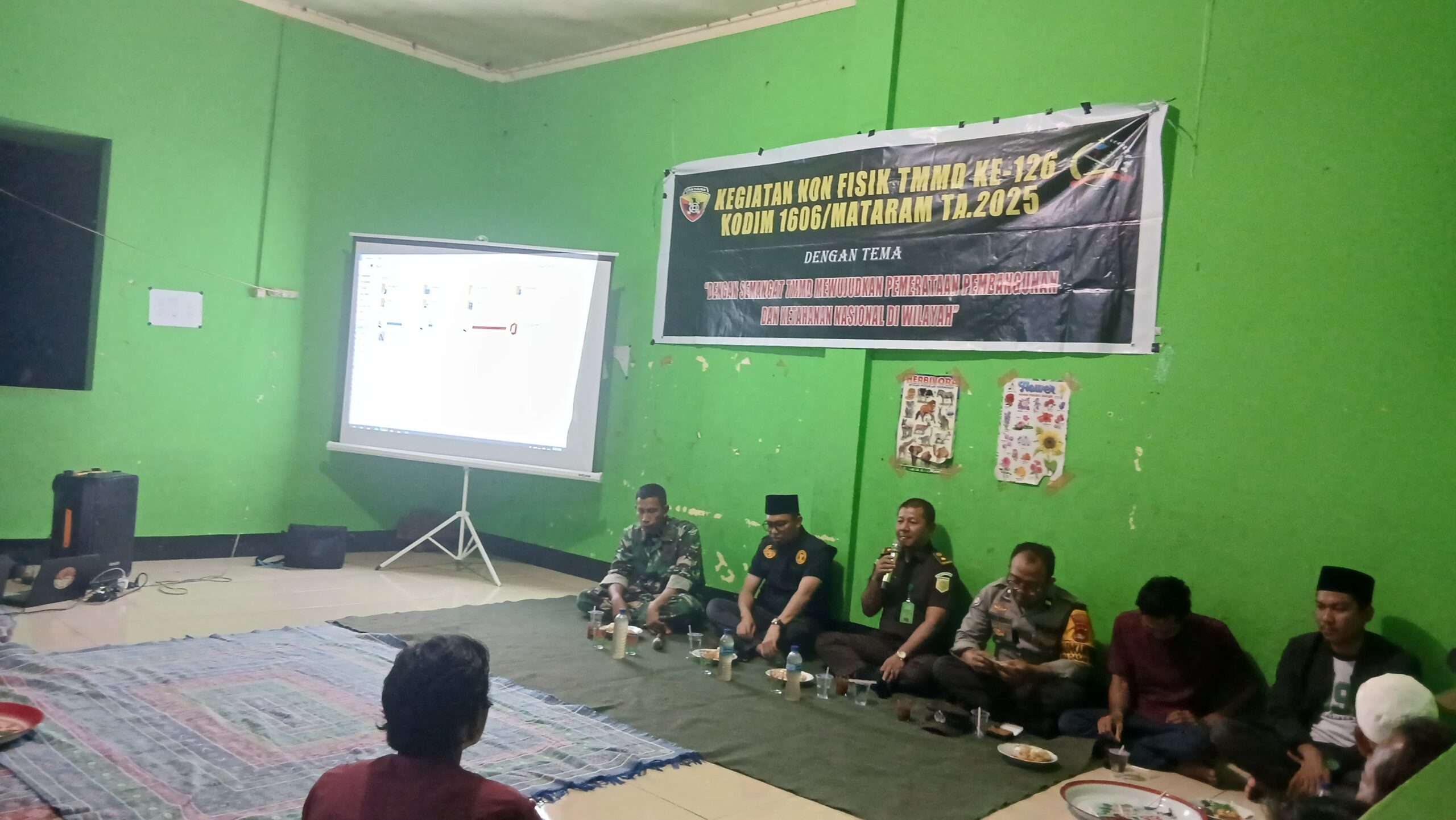 Matalensa–Lombok Barat, NTB – Satgas TNI Manunggal Membangun Desa (TMMD) ke-126 Kodim 1606/Mataram terus menunjukkan komitmennya bukan hanya dalam pembangunan fisik, tetapi juga pembentukan karakter masyarakat. Melalui kegiatan non fisik, Satgas TMMD menggelar sosialisasi bahaya narkoba dan penyuluhan hukum di TK PAUD Al-Ahari, Dusun Murpeji, Desa Dasan Geria, Kecamatan Lingsar, Sabtu malam (1/11/2025).