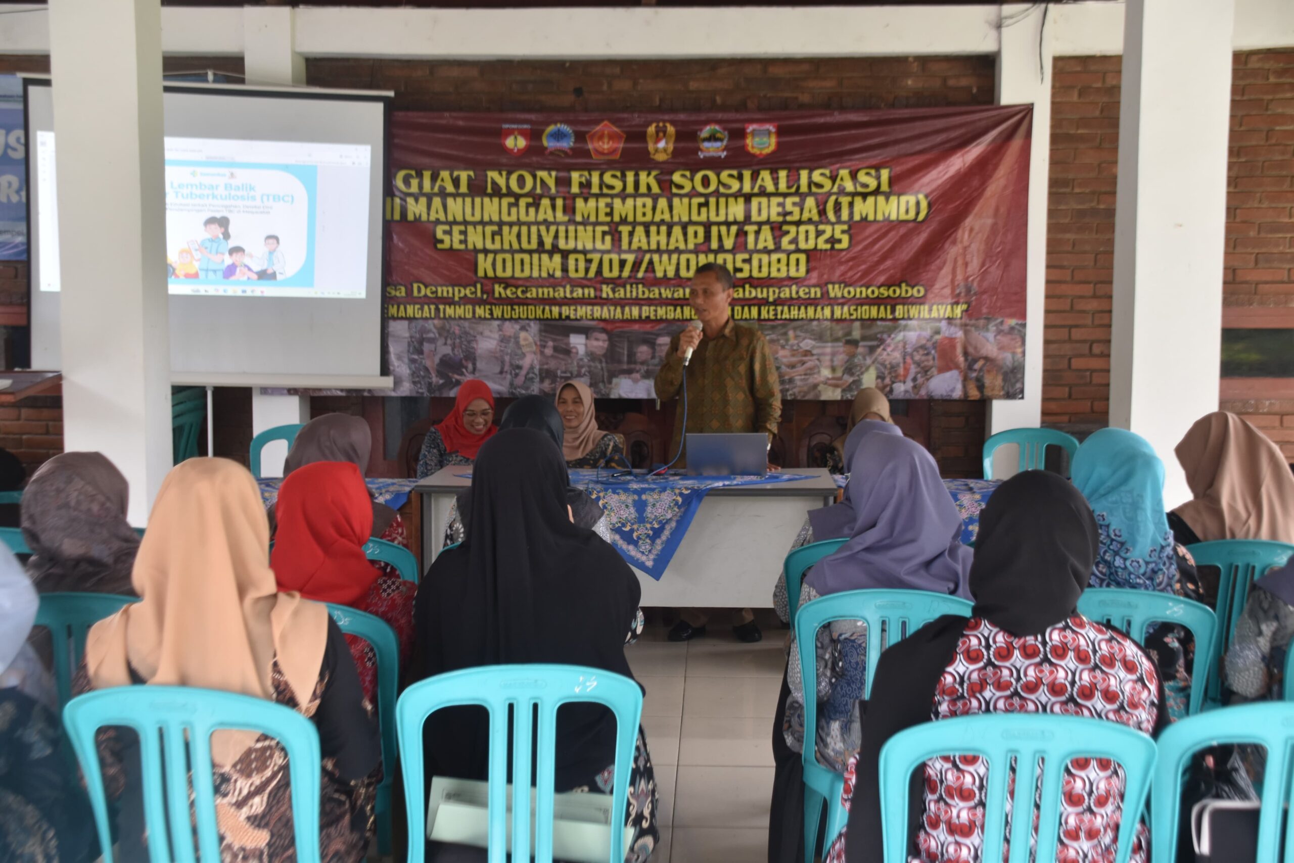 Matalensa—Wonosobo – Program TNI Manunggal Membangun Desa (TMMD) Sengkuyung Tahap IV Kodim 0707/Wonosobo tidak hanya berfokus pada pembangunan fisik, tetapi juga pemberdayaan masyarakat melalui kegiatan non-fisik. Salah satunya adalah sosialisasi pencegahan penyakit tuberkulosis (TBC) yang digelar di Desa Dempel, Kecamatan Kalibawang, dengan menghadirkan Junaedi, wakil ketua pengurus Persatuan Pemberantasan Tuberkulosis Indonesia (PPTI) Wonosobo**, sebagai narasumber. (23/10/2025)