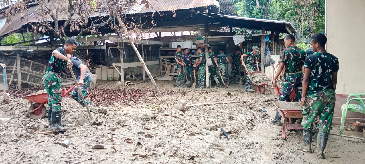 Tim gabungan yang terdiri dari personel Yonzipur, Babinsa, serta para ustad bekerja bakti membersihkan lumpur tebal di ruang belajar dan area kamar mandi. Pembersihan juga mencakup bagian jendela agar lingkungan sekolah kembali bersih dan nyaman untuk digunakan.