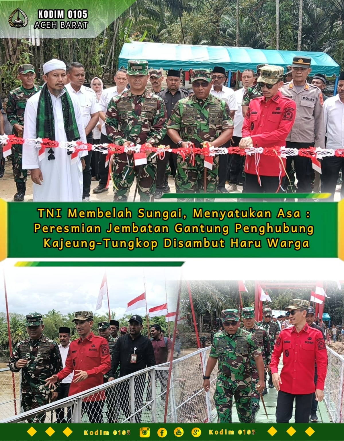 Di podium yang sama, Bupati Aceh Barat Tarmizi, S.P., M.M., mengatakan jembatan ini sangat bersejarah dan menyampaikan apresiasi serta rasa terima kasih kepada jajaran Korem 012/Teuku Umar yang telah bergerak cepat merehabilitasi jembatan gantung yang terdampak banjir pada akhir tahun lalu.