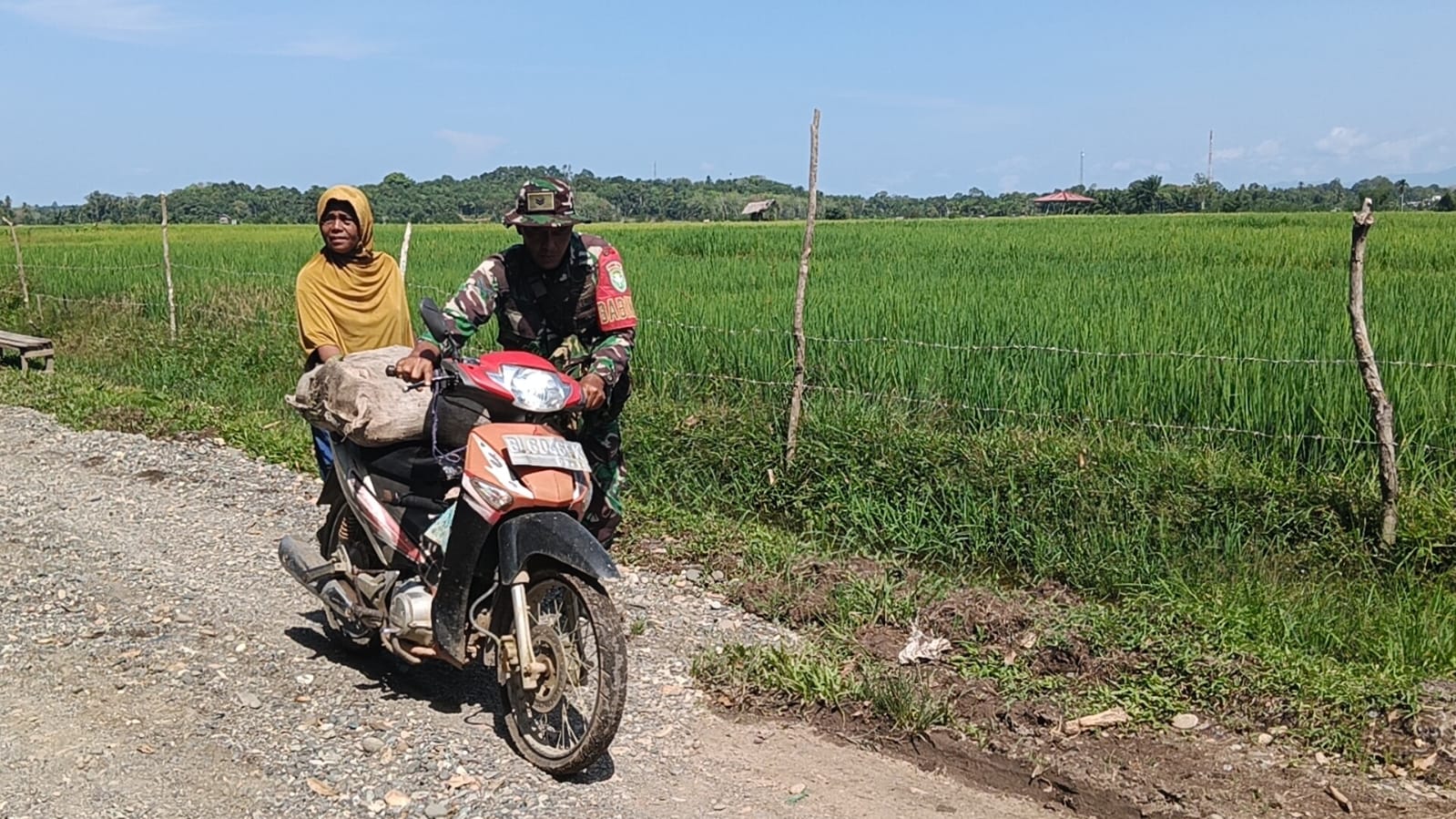 Di tengah padatnya aktivitas dan deru alat kerja, perhatian Personel Satgas tertuju pada seorang warga yang tengah kesulitan mengangkut hasil panennya. Tanpa komando panjang, beberapa Personel langsung meletakkan alat kerja dan bergegas membantu mengangkat serta memindahkan hasil pertanian tersebut ketempat aman.