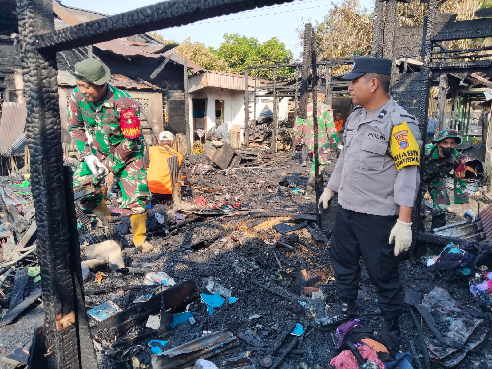 Di lokasi kejadian, personel TNI bersama Polri, BPBD, serta relawan bahu-membahu membersihkan sisa material bangunan yang terbakar guna mempercepat proses pemulihan lingkungan.