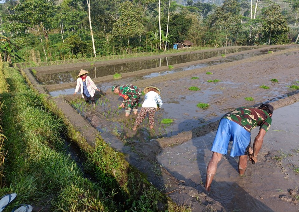 Kegiatan tanam padi kali ini dilakukan dengan metode tradisional atau yang akrab disapa oleh masyarakat setempat dengan istilah tandur (tanam mundur). Meskipun teknologi pertanian terus berkembang, metode tradisional ini dinilai masih efektif untuk menjaga presisi jarak tanam di lahan tertentu. Pelda Slamet nampak antusias berbaur dengan petani, menyusuri lumpur sawah demi memastikan bibit padi tertanam dengan baik.